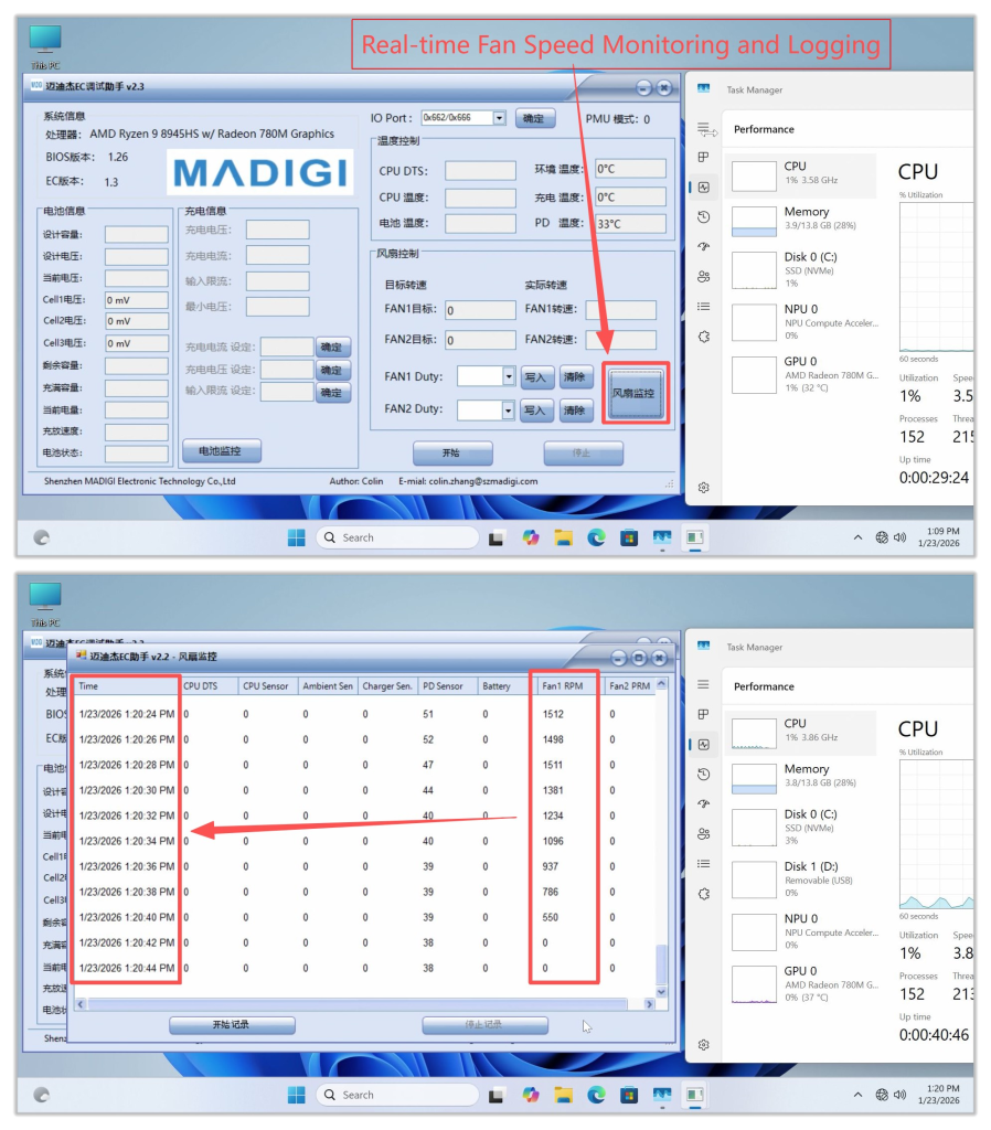 - It is recommended to open an additional Task Manager window and place it nearby to monitor hardware resource usage under different fan speeds. Generally, higher CPU usage leads to increased temperatures, which in turn causes the cooling fan speed to rise.