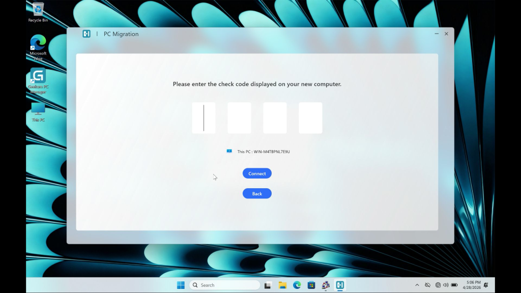 • Enter the random 4-digit password generated by the old computer on the new computer