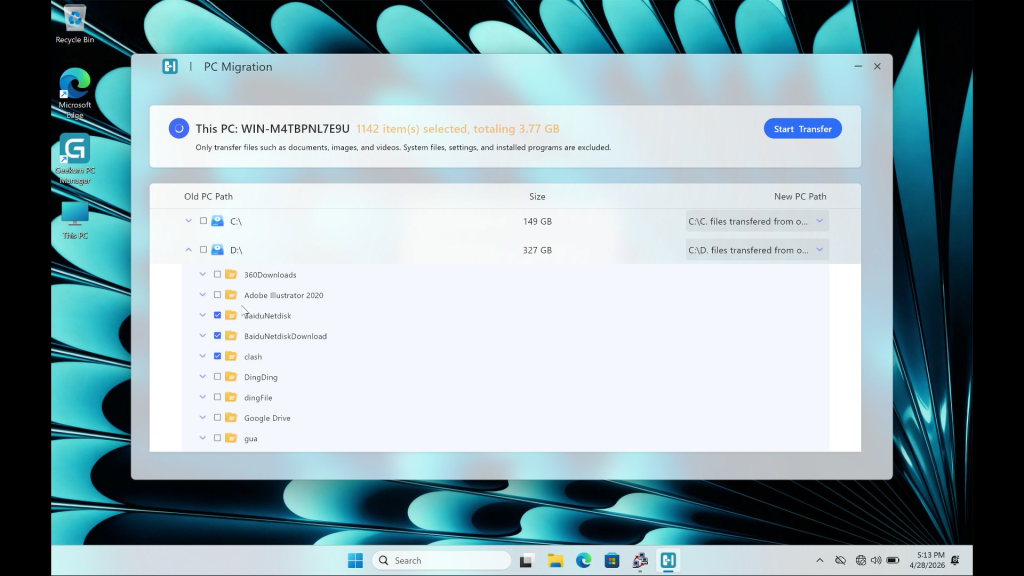 • By default, files are transferred to the C drive. Click the New PC Path on the right to change the backup file directory, check the files you want to back up, then click “Start Transfer” in the upper right corner.