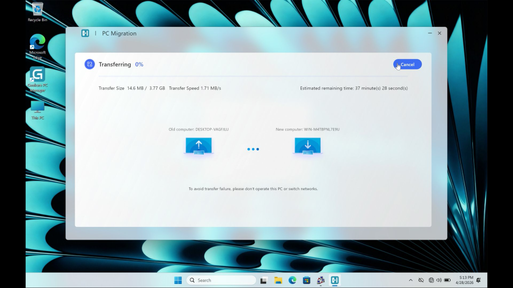 • The transfer officially begins. Data transfer does not go through the network. Keep the devices powered on; sleep or hibernation may interrupt the transfer.