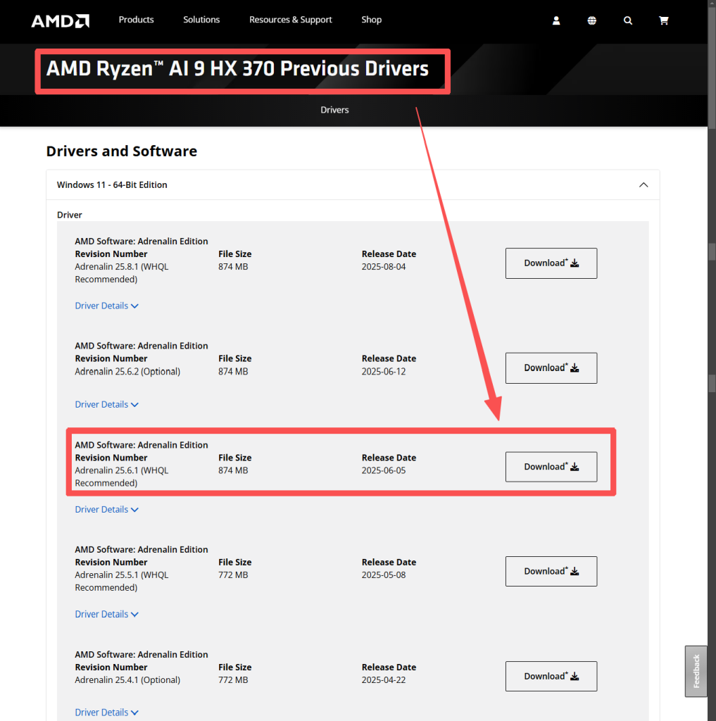 - Go to AMD Official Website to Download the Driver:AMD Software: Adrenalin Edition Revision Number Adrenalin 25.6.1 (WHQL Recommended)