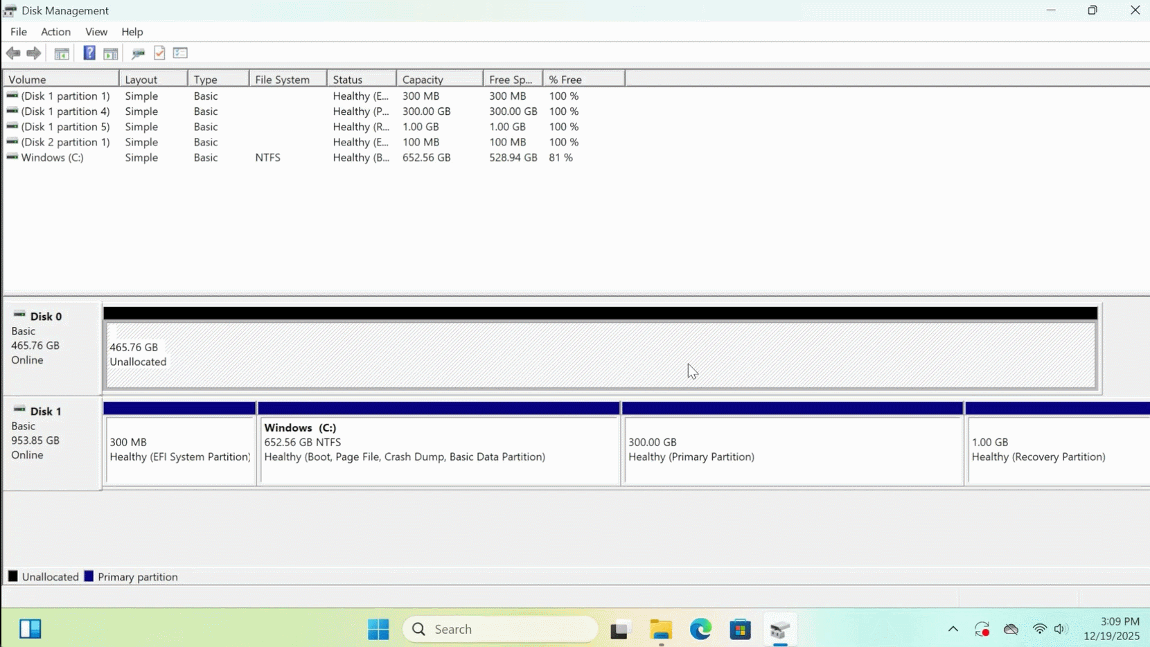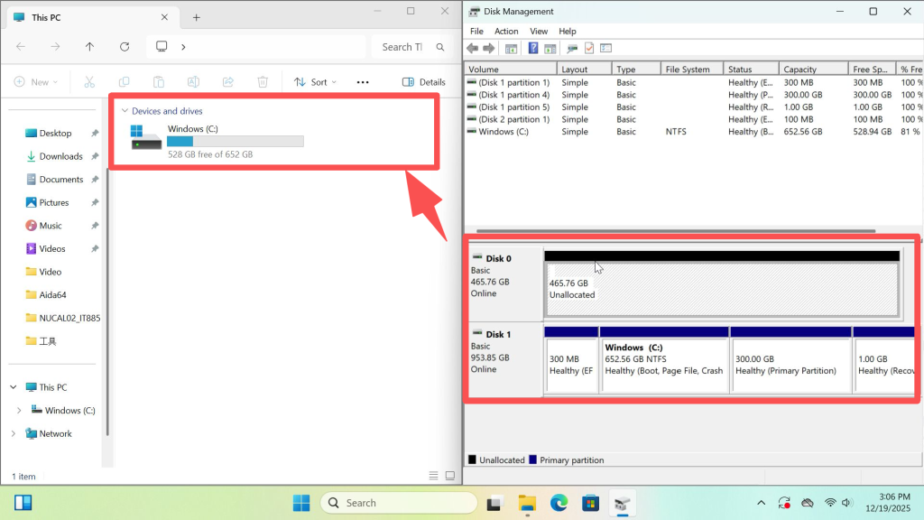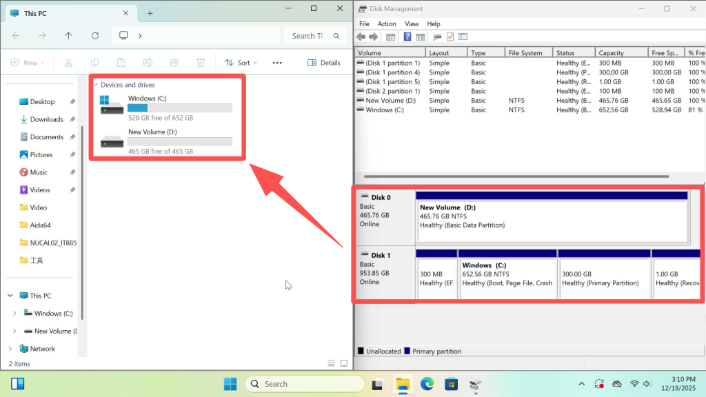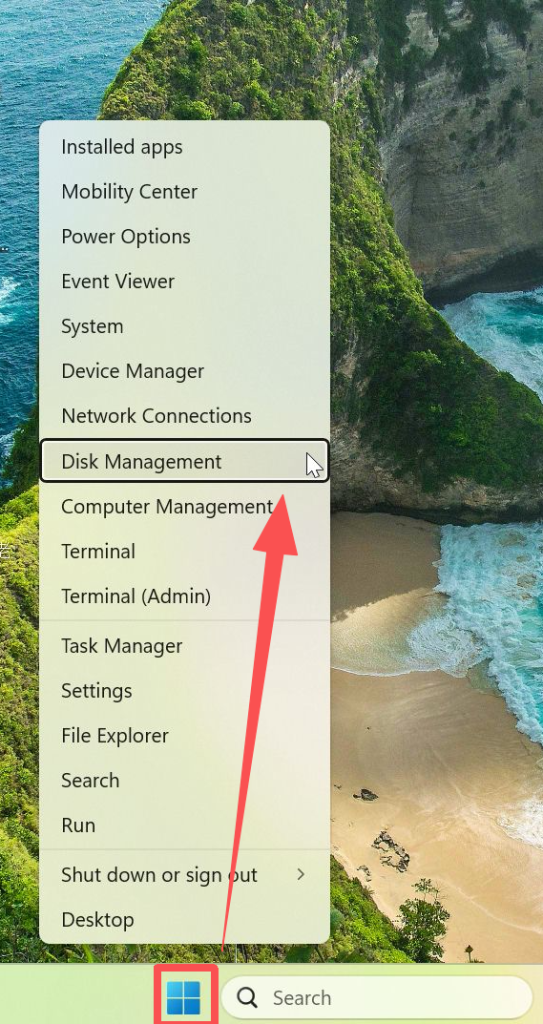 - The hard drive is detected in the BIOS, but no new disk partition is displayed in the operating system. This may be because the newly installed drive’s space has not been formatted or assigned a drive letter (such as C:\, D:\, E:\). Right-click the Windows icon on the taskbar, select Disk Management, locate the newly added hard drive, and proceed with formatting it. The specific steps are as follows: