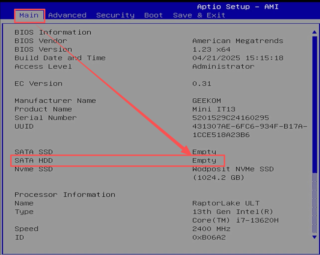 - Navigate to the Main tab in the BIOS and scroll down until you see the SSD information. Using the IT13 as an example, the comparison between having an HDD installed and not having one installed is shown in the figure below.