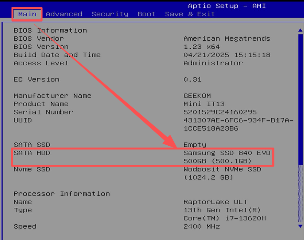 - The memory and hard drives installed internally in GEEKOM products can be viewed in the BIOS for their corresponding model and specification information. To access the BIOS, press the Del/Delete キー repeatedly during startup or reboot until the BIOS menu appears.