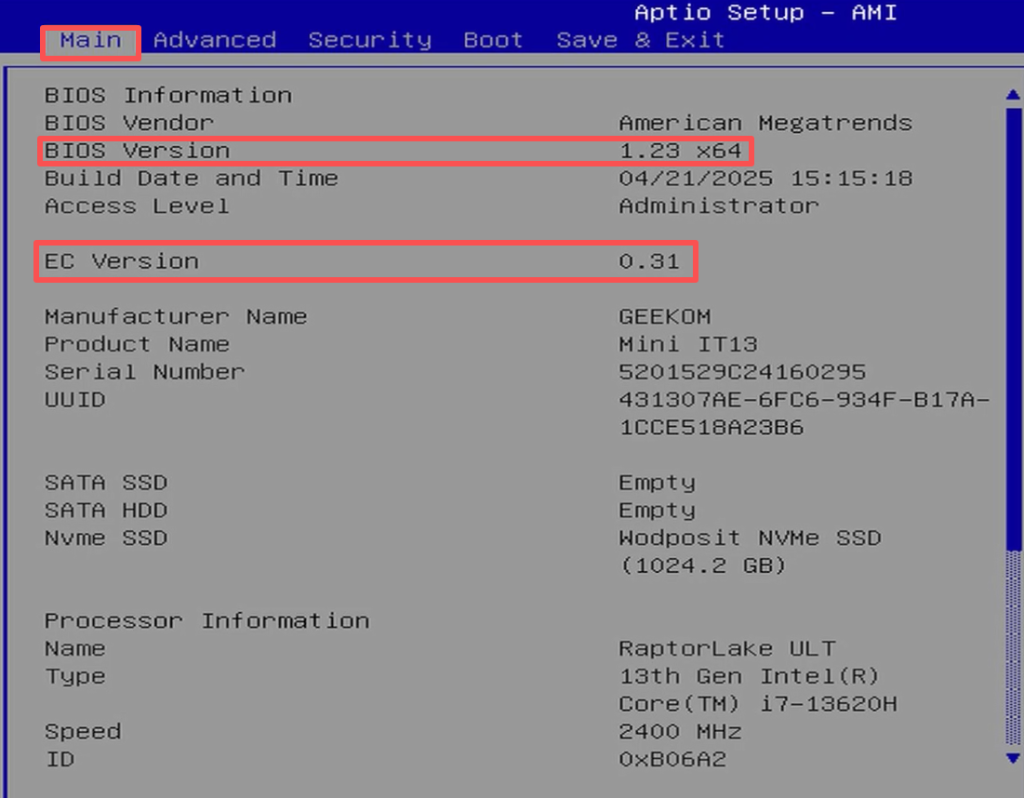 - 6.After the device starts normally, check the BIOS or EC version again to see if it has changed. If there is a change, it indicates that the update was successful.