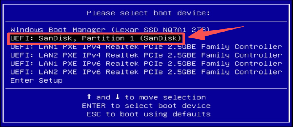 - 3.Use the arrow keys to select the inserted USB drive, then press Введите to boot.